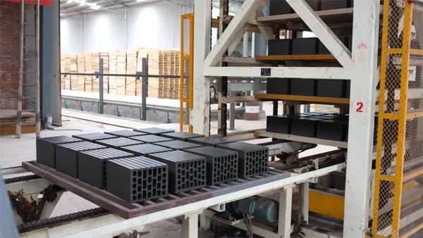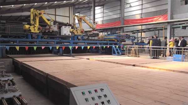 2011年,砖瓦装备总体水平有一个较大的提升,主要表现在砖瓦机械生产企业重视技术创新,加大了自主研发能力,提高了加工装备水平,大型真空挤砖机(75、80、85型)、大吨位液压压砖机(压力3200吨)、全自动码坯机组、码坯机器人、先进的窑炉设备等产品的年总生产量、产品质量明显增加,为先进的生产线提供了机械装备保证。国内装备企业与国际公司的技术合作,提高了国产设备的技术含量;国外公司在国内独资建设工厂生产挤砖机及配件,降低了设备成本并拓宽了中国市场;先进智能化砖瓦机械装备的开发研制和生产,促进了砖瓦工业装备的技术进步。烟气净化处理设备得到了进一步发展;产品打包机市场需求加大,列入了砖瓦机械生产企业2012年技术研发和生产计划。砖瓦装备技术水平有望在今后几年内得到快速提升。目前,60型以上真空挤出机、全自动切码运系统,码坯机器人、隧道窑焙烧和大吨位液压式压砖机、蒸压釜等装备,成功应用到各地新建制砖生产线上。提高了国内砖瓦生产的自动化水平。例如,除了老牌的贵阳建新机械厂以外,短短三年间,国内能够生产自动码坯机的厂家已经达到20余家,图2为机器人码坯的生产线。