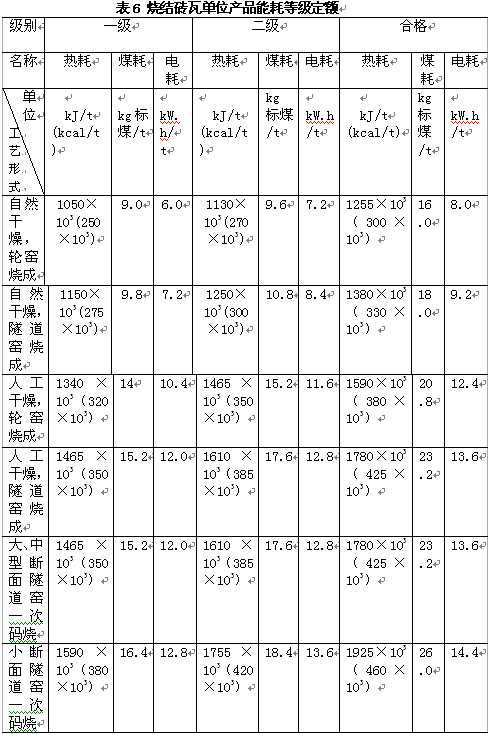 烧结砖瓦能耗等级定额按建材行业标准JC/T713—2007的规定,如表6所示。