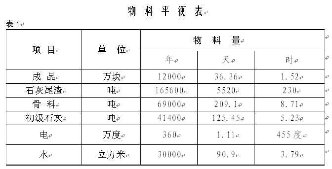 废渣在石灰生产工艺中已经处理,不需要再进行初级破碎,直接就可以进入生产流程。经过对石灰尾渣和初级石灰进行检验的结果表明,其结果基本符合生产碳化制品的要求。石灰窑排出尾气温度约180~200℃,粉尘浓度约20g/m3,CO2浓度可达40%,具有很高的利用价值。通过配方计算,物料平衡见表1。