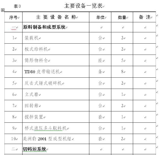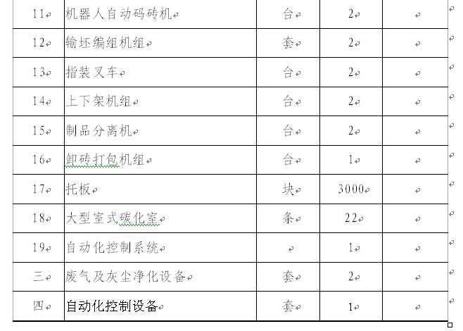 经过认真筛选,主要生产装备全部选用国产定型设备,其中关键设备——半成品的上下架和碳化装置,采用我院为烧结砖厂研发的单层干燥系统,从而使整个生产线实现自动化,部分设备需要我院联合有关装备制造厂家重新开发。设备见一览表(表3)。