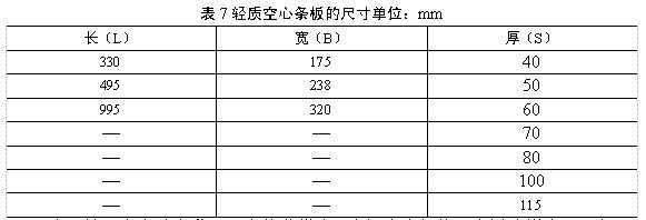 (a)对外壁及内肋厚度的规定;(b)对空心条板孔外壁及内肋厚度的规定。此外, 对空心条板的抗折强度有专门的规定,即必须能够承受500牛顿的弯曲荷载(允许的最小单个值为400牛顿)。对空心条板的尺寸误差规定为:在纵向上为长度的1.5%;在横向上为高度的3%。德国轻质空心条板的常用尺寸见表7。