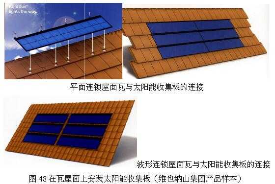 众所周知,太阳能收集板绝大多数是安装在屋顶上。在广泛利用太阳能这种大环境下,西欧的烧结屋面瓦制造公司也纷纷加速了适应于太阳能收集板安装的新形式屋面瓦以及新的屋顶构造形式的研制和开发。例如欧洲最大的烧结屋面瓦生产集团——维也纳山公司开发的平面连锁屋面瓦与太阳能收集板的结合方式、波形连锁屋面瓦与太阳能收集板的结合方式(见图48)。
