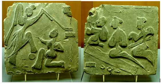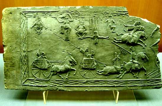 之一: 斜索戏车空心画像砖(为东汉时高浮雕空心画像砖作品,河南新野县出土,该砖高32cm,残长62cm;现存河南历史博物馆,照片摄于河南历史博物馆)