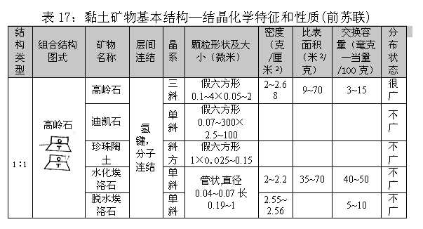 黏土矿物的结构层可以由两层(一层四面体和一层八面体)、三层(两层四面体和一层八面体)、四层(二层四面体和二层八面体)组成。结构层的特征是黏土矿物最重要的分类标志。根据单元层的结构可划分出若干类型的黏土矿物:具1:1、2:1和2:1:1结构层类矿物。自然界还广泛分布着所谓的混层矿物,其结构系由二种或几种结构层类型有规则或无规则地相间排列组成。在每种黏土矿物类型范围内,根据结构层之间相互作用的性质和层间空间的填充情况可划分出若干矿物组。这样,在1:1层矿物类型中划分出高岭石组;在2:1矿物类型中划分出蒙脱石组、水云母组和蛭石组,在2:1:1矿物类型中划分出绿泥石组,而所有具层—链结构的矿物则结合成为石棉—海泡石组。每个矿物组包括一个或数个矿物种类(矿物),它们的化学成分、八面体中各空间的填充情况和结构层的叠置都有区别。表17列出了在自然条件下遇到的主要黏土矿物及其结构特征(前苏联)。