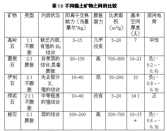 下列表中(表18)比较了各种黏土矿物,不同的判定标准将在后面的章节中详细阐述。