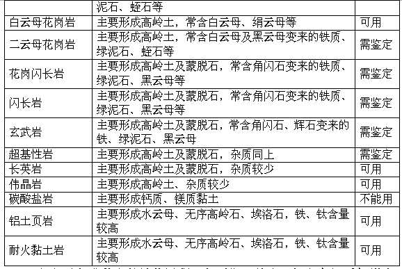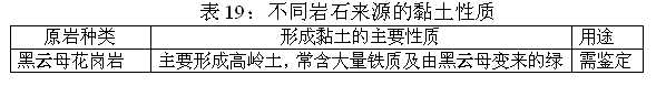 自然界形成黏土的物质来源是非常广泛的。任何岩石(各种沉积岩、火成岩或变质岩),特别是含硅酸盐矿物比较丰富的岩石,经风化、水解、热液蚀变等作用后,都可以变成黏土。而疏松分散的黏土,经搬运沉积,压实硬化又可以变成坚硬的岩石(即所谓之硬质黏土岩)。土化与岩化,循环演进,这种自然界的规律,永无终止。但是,并不是任何岩石变成的黏土都能满足烧结砖瓦产品的要求。表19中列出了形成黏土的原岩及形成的黏土主要矿物和用途。形成黏土的原岩性质对生成黏土的性质有密切关系,故在评价黏土矿床时,对成矿母岩应予足够的重视。