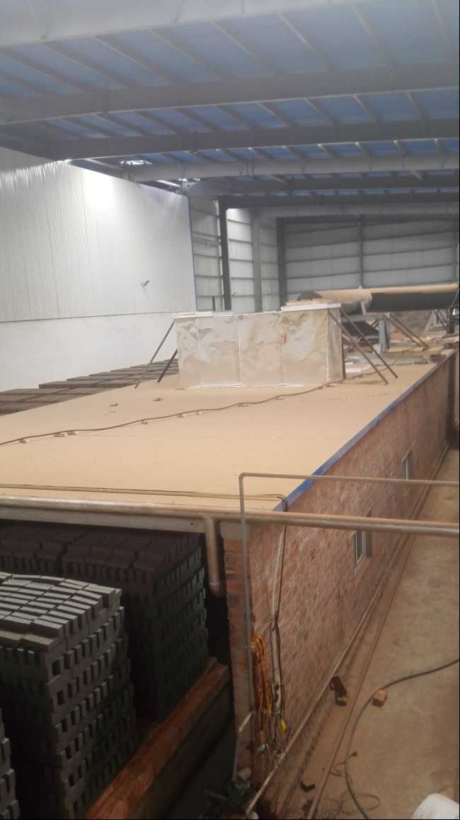 这里的焙烧窑断面4.6m,共27个车位。干燥室17个车位。预干燥系统利用干燥室端空余出来的位置而建。共10个车位长。取焙烧窑余热对预干燥室内停放的砖坯进行预干燥。供风形式除顶部供热风外,利用焙烧窑窑顶的余热锅炉输送蒸汽到预干燥室内分布在两侧墙壁上的暖气片。整个系统布局与外观结构如下图: