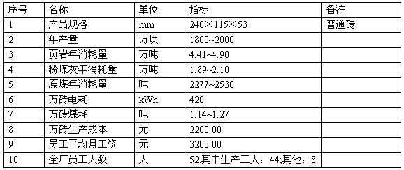 企业本次技术改造,将原生产线全部拆除,建设一条完整的年产5000万块(折普通砖)页岩空心砖生产线,采用“一次码烧”工艺,2条隧道干燥室,1条烧成隧道窑,机械化程度较高,岗位工人数较少,全厂员工总数仅为53人,与原生产线员工人数基本一样。然而,劳动强度大幅度降低,全员劳动生产率达到94万块/年.人,劳动生产率大幅度提高。