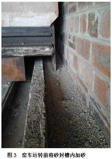 (3)点火后窑车一旦开始运转加砂工作就要跟进,不要认为窑车运转量少而忽略。一旦砂封缺砂,想恢复到正常需要一段时间,这一段时间窑炉密封无法解决,操作控制难度较大。