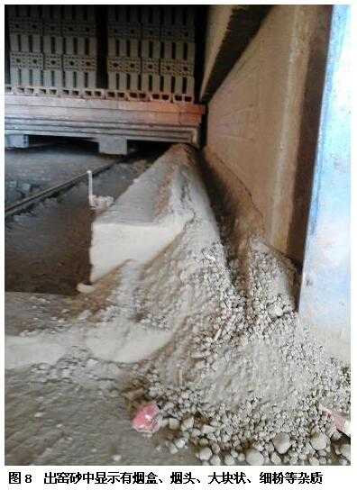 不良习惯导致砂封堵塞。有员工习惯将一些易燃的废弃物(烟盒、塑料袋、卫生纸等)塞到窑车砖垛间或丢入加砂口(见图7),认为在进入焙烧窑后会燃烧消耗,但没考虑在干燥室内由于大风压会导致杂物散落到砂封槽内,造成砂子流动不畅,一旦聚集,很难清理(见图8)。