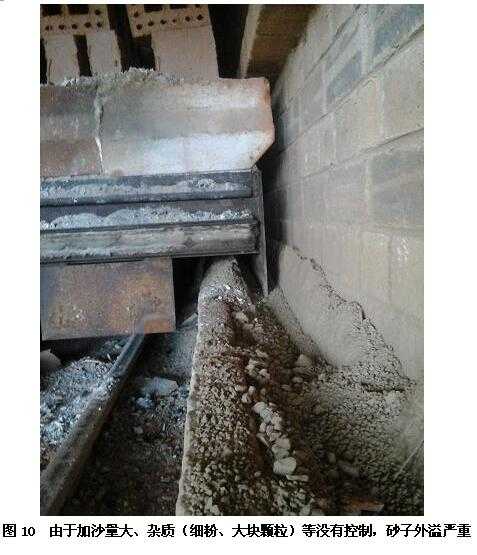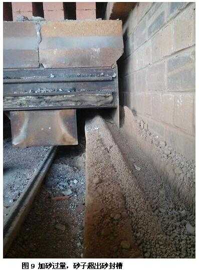 (2)从出窑端出砂现象判断:砂封槽缺砂可导致漏气,砂子过多也会造成事故。从图9、 图10 可以看到,由于加砂量过大,砂子溢出砂封槽的现象。这就要求对出砂口经常观察,当发现有砂子过量、溢出砂封槽现象时,要控制加砂量,防止砂子翻过砂封槽。当轨道与砂封相临时最为危险,细粉覆盖到轨道后,阻碍窑车运转;