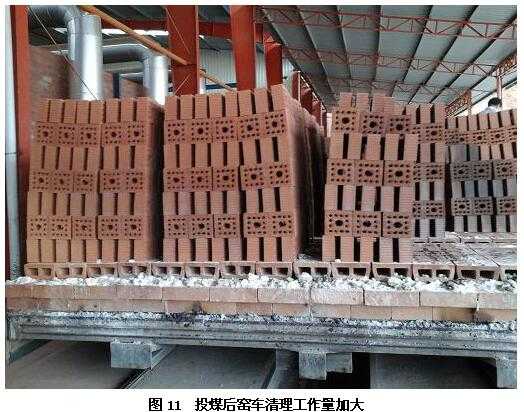 (3)从窑顶投煤情况判断:窑顶投煤是提升窑温手段之一,利用投煤孔加煤是临时措施,如果经常性需要加煤提温保温,就表明有问题了。窑顶投煤属外燃,外燃和内燃在热值利用上有很大差距,外燃增加了操作人员的工作量,从购买、运输、提升、投放、清理整个环节缺一不可(见图11),因频繁打开投煤孔也会影响到窑内烧结气氛,影响工作环境。加边火是当观察高温烧结时两侧火势较弱或产品出窑后发现窑车两侧制品欠火,操作人员利用两侧投煤孔加煤来调整。所以,当排除码坯方式、热值等影响因素外,经常窑顶投煤,特别是加边火投煤,就要考虑是否是因砂封缺砂导致窑炉两侧漏气因素了;