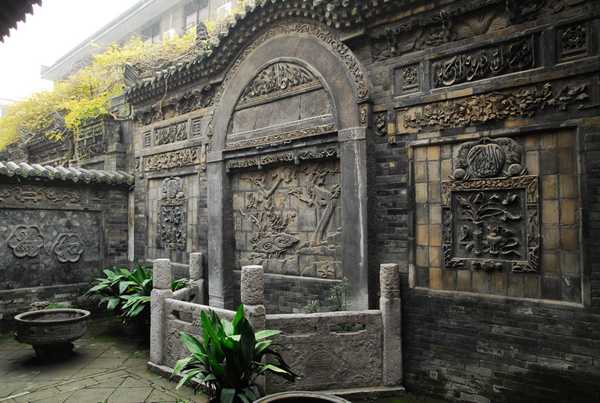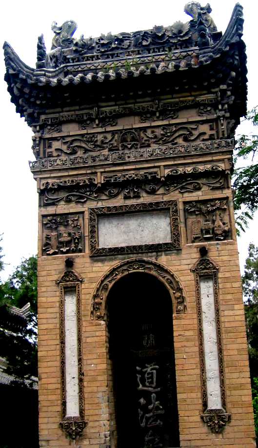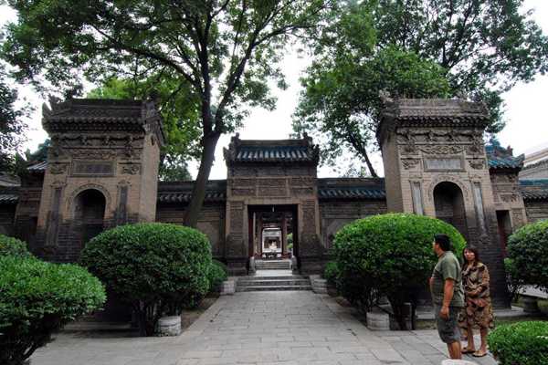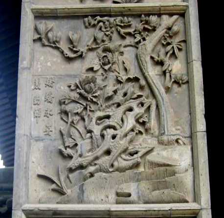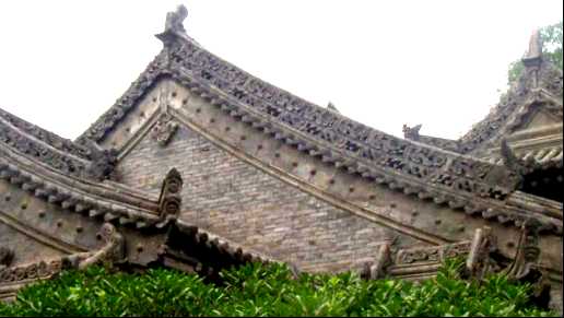 在其照壁、殿堂窗台下、门洞上方和周围、房屋山墙、柱身正面、柱顶、碑亭、屋脊、围墙、窗楣等处有数百幅砖雕,尤如明清时代的砖雕博物馆,仅选其中几幅略示如下(注:这些砖雕没有固定的名称,文中名称为笔者会意):