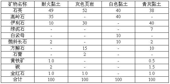 每一个烧结砖瓦厂所使用的原材料中不可能都存在有各种各样的矿物,但也没有完全相同矿物组的两种烧结砖瓦原材料。因为每一个天然矿床多半在变化程度上都有所不同,每一种原材料在所含矿物上都有或多或少的差异,然而,总是在一定的范围内变化,例如黏土矿物,填充性矿物,熔剂性矿物或反应活性较大的矿物成分的含量均有所不同。在各个地质时代的红焙烧色黏土和页岩以及耐火黏土也有其基本相似之处。
