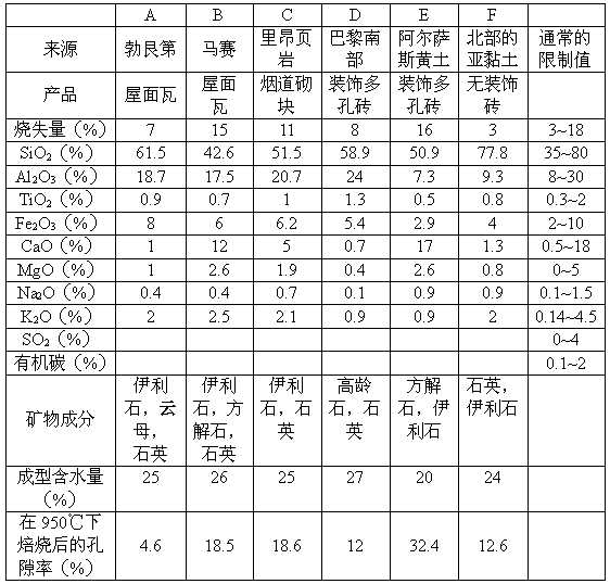 法国和意大利对用于制造烧结砖的黏土原材料进行了非常详细的矿物分析,提供了更多的有用信息。结合化学分析,用半定量分析方法(误差的幅度<10%)对其矿物学成分进行了评估。连同在研究期间测定到的极端数值一起,给出了每种类型的原材料黏土的性能(见表24和表25)。