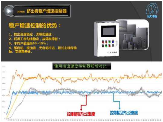 为克服挤出机的上述缺陷,满足用户节能增产的需求,河南欧帕集团公司在长期深入生产现场的基础上,结合国内现有挤出机的现状,经过多年研究试验,取得了重大的突破——开发研制出了挤出泥条速度在线监测控制器,现已在安徽、四川、河南等地用户现场得到了实际应用,取得了非常好的效果。这种挤出泥条速度在线监测控制器与变频器联通,借此控制挤出机主电动机的转速,在很宽的范围内有效地控制住了挤出泥条的速度,达到了稳产、高产、保护设备的目的。更重要的是这一挤出泥条速度在线监测控制器,使得挤出机不能进入生产线自动化控制平台成为了历史。