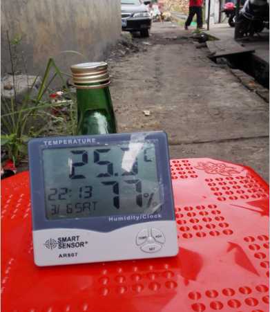 首先,介绍一下海南岛的气候特征:海南岛四面环海,地处我国南部热带北缘,属热带季风气候,素来有“天然大温室”的美称。这里长夏无冬,年平均气温22~26℃,全年无霜冻,冬季温暖;雨量充沛,年平均降雨量为163mm。雨源主要有锋面雨、热雷雨、和台风雨。全年湿度大,年平均气压约23百帕至26百帕。在改造调试的五十天时间内,测得平均湿度为77%。空气湿度大的一个典型例子就是:刚刚洗过晾晒在日光下的湿衣服两天晒不干。其空气湿度不亚于内地干旱地区砖坯隧道干燥室内的空气湿度。仪器测得空气湿度如下图示: