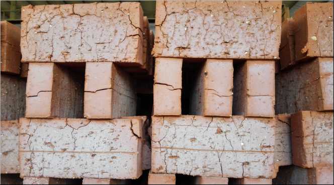 有些窑炉公司或者设计单位,往往拿一张一成不变的图纸去建造不同原料、不同地域、不同气候区域的窑炉,一套图纸走天下,从不考虑当地的原材料、气候等因素是否适合这种工艺。这种工艺适合北方但未必适合南方,适合平原但未必适合高原,适合煤矸石但未必适合页岩,适合页岩但未必适合黏土,适合气候干燥地区但未必适合多雨高湿地区。再就是用短短118米的窑既干燥又焙烧,根本满足不了干燥脱水所需以及焙烧理化反应所需;即便勉强烧出砖,烧制出的产品也是根本不符合国家标准要求的次品砖,根本达不到国家标准要求的质量标准。用这种墙材砌筑的建筑物肯定会是处处遗留隐患。这种“烘烧一体”的设计工艺,笔者认为除了能减少分体式干燥——焙烧时从干燥室出来进窑损失的一小部分热能,减少一部分投资外,对砖的质量弊大于利!尤其是在这种高温高湿地区,而且把隧道窑建的这么短,能干燥焙烧出质量达标的优质砖无异于天方夜谭。改造调试前的产品如下图: