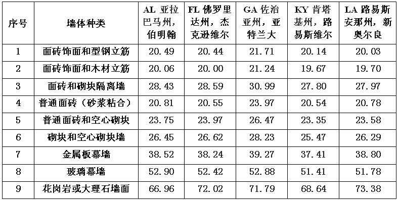 表1. 美国东南部几个城市商业建筑不同墙体的平均造价*
