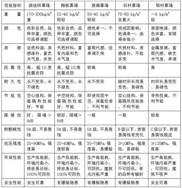 为了一目了然地对比烧结装饰砖幕墙与其他几种幕墙的性能,作者总结在表2中供参考。