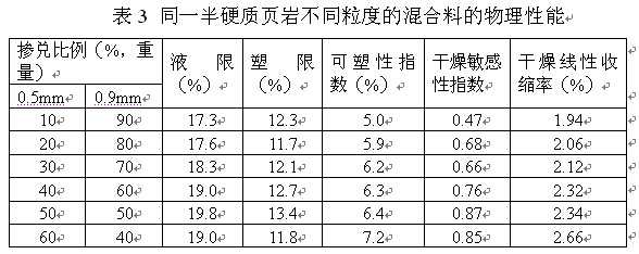 对煤矸石、页岩等这些靠颗粒尺寸减小而获得塑性的材料来讲,使用这种方法时就会有很大的偏差。因为煤矸石、页岩这类原材料的可塑性的高低,是依靠加工破碎,使其颗粒尺寸的减小到一定程度后,加人水分后颗粒的疏解(陈化)等来实现的,并在加工处理过程中是可变化的。普通制砖黏土所具有的可塑性指数是相对稳定的,而这类依靠破碎加工处理使颗粒尺寸减小而获得可塑性的材料,其可塑性指数在加工处理过程中是可变的,例如某种煤矸石在试验室中全部粉碎到0.9mm以下时,按照土工试验方法,对其可塑性指数测定,可塑性指数仅为7.2%,但是加入40%的过火矸石后(基本上无可塑性),其混合料经加水搅拌、陈化、细碎对辊机、真空挤出机后,其成型后小试样的可塑性指数竟达到了10.5%;又如某地的页岩,在试验室中全部粉碎至0.9mm以下时,按土工试验方法测得的可塑性指数为8.4%,但是加人40%(重量比)的粉煤灰后,经加水搅拌、陈化、细碎对辊机碾练,真空挤出机挤出后的小试样的可塑性指数竟达到了9.5%。按照土工试验方法经过再验证试验后仍是如此,这就充分说明了目前砖瓦行业沿用的土工试验方法不能正确地反映出煤矸石、页岩这类原材料在加工、处理、成型中物料的特性。为了进一步证明页岩(或煤矸石)这类原材料依靠颗粒尺寸减小而获得塑性的事实,在实验室中对石家庄附近某地的半硬质页岩,将其分为两组进行粉碎。一组为全部通过0.9mm筛;另一组为全部通过0.5mm筛。而这一同样矿物组成的页岩,仅因粒度不同,其可塑性指数的差异很大,一为4.8%(0.9mm);一为8.9%(0.5mm)。为进一步验证这种现象,又将这两组分别粉碎的页岩原材料按不同比例掺合在一起,测定其可塑性指数、干燥线收缩率和干燥敏感性指数,测定结果见表3。