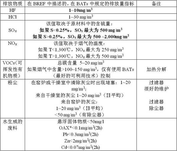 表2 欧盟陶瓷工业(含砖瓦)排放量限制指标