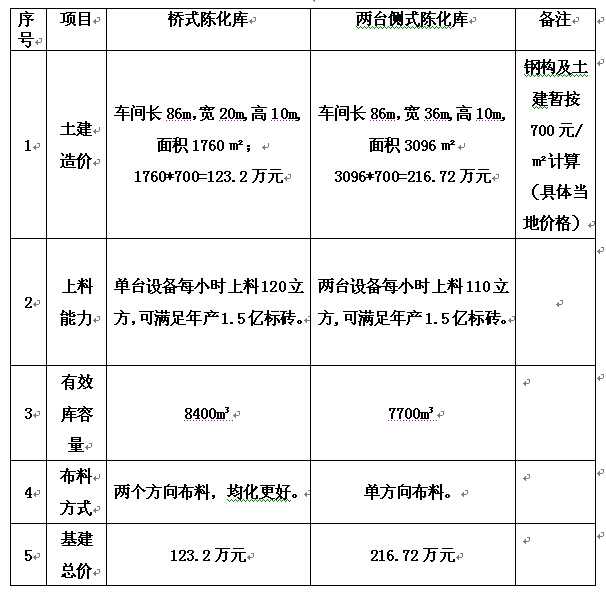 桥式陈化库与两台侧式式陈化库的比较(库容量要求8000万立方,年产1.5亿标砖上料产能)