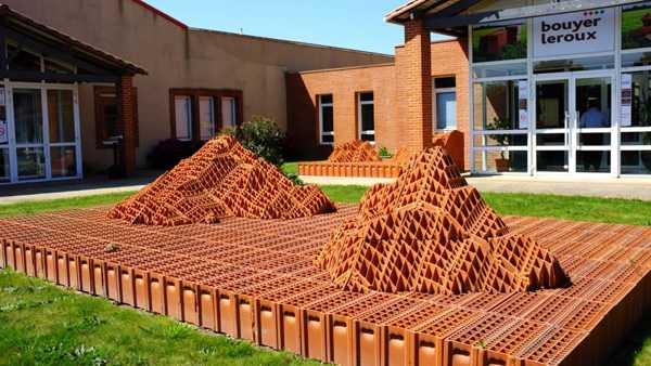 法国利用生物燃料焙烧空心砌块的公司(Bouyer leroux)位于法国西部,我们参观的工厂有三条空心砌块生产线,年产量折合中国普通砖体积约3亿块。该公司为了宣传和突出其产品是用生物燃料焙烧而成的特点,在其产品的包装上就印制有生物燃料的标记(图1),此外在厂区大门外和办公室前均有用生物燃料焙烧的空心砌块雕刻造型(图1)。