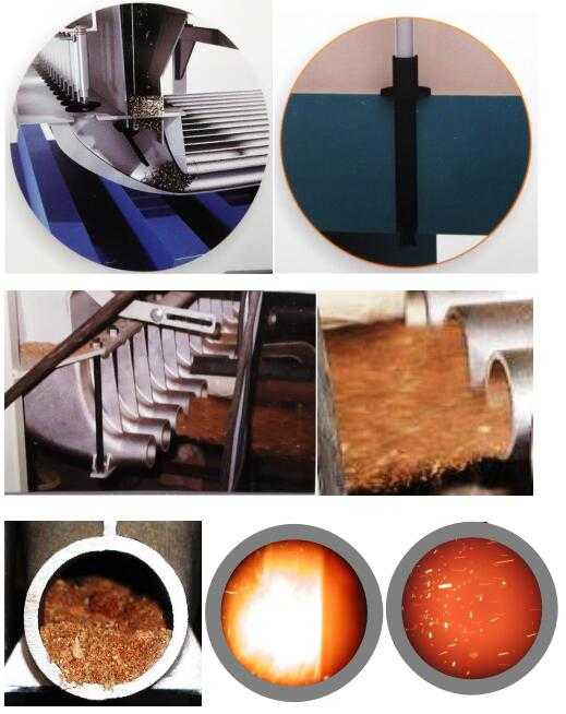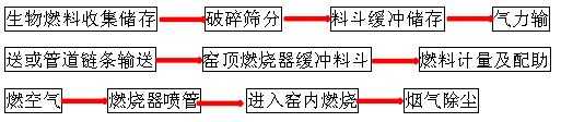 颗粒状的生物燃料使用可以使用压缩空气输送到窑顶燃烧器上的缓冲料斗;也可以使用类似于水车管道一样的管道内链条输送到窑顶燃烧器上的缓冲料斗。管道内链条输送避免了压缩空气输送时生物燃料的外泄,输送更可靠。输送到缓冲料斗的颗粒状生物燃料,经计量后进入燃烧器喷管前腔,由间歇式供给的压缩空气将颗粒状生物燃料送入窑室内燃烧。颗粒状生物燃料的输送及燃烧器的示意见图8。