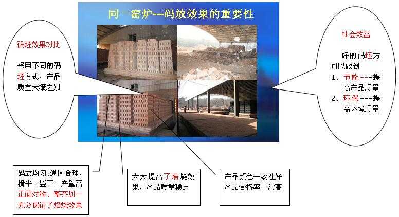 烧结砖瓦,坯体无论是在干燥还是在焙烧中,都需要码成一定样式的坯垛。对于内燃砖来讲,“七分码坯、三分焙烧”尤为重要。只要码坯方法、码坯密度一定,坯垛一经码成,是否好烧,本质上已无法改变。烧窑工只能根据对窑内火候的观察,决定是否需要火眼投外燃、调节风机频率及提闭风闸,只能进行微调控制。如果坯垛稳定及坯体内燃热值控制稳定,烧窑工就可安心睡觉了。有些砖厂已取了消烧窑工,这其中不难看出码坯形式的重要性。要达到好的焙烧效果,前提必须是能保证良好的通风要求的合理码坯形式。坯体在干燥、焙烧时,气体必须能与坯垛中的坯体进行充分的接触。合理的坯垛形式能保证坯垛中气体的合理流动,可大大提高传热效果,降低坯垛的温差,有利于干燥和焙烧,生产稳定,产量提高,同时成品质量也会大幅度提升。