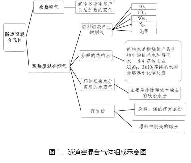 4、隧道窑混合气体:把预热段混合烟气和余热空气干燥砖坯后的混合气体称隧道窑混合气体。从成份上讲包括两大部分:一是燃料燃烧产生的燃烧烟气(主要包括CO、CO2、NOx、N2、O2、H2O等)和预热段蒸发的水蒸气(H2O)、分解的结构水水气(H2O)、挥发份等,二是来自冷却段加热的“热空气”。