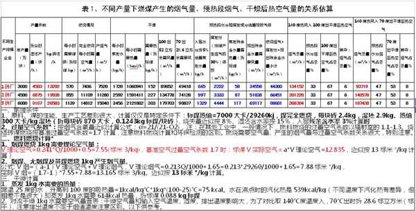 由于隧道窑燃烧、烟气的产生、干燥过程中受不同原料、燃料、气候、海拔高度等条件的影响因素太多。这里仅仅是利用现有的经验公式进行定性的分析,不一定正确,可通过实际检测数据验证。通过计算不同情况下,燃料燃烧、预热段水分和挥发成分估算、干燥热风温度的不同,预热段烟气占隧道窑混合气体的比例小于50%,供参考,详细计算见表1。