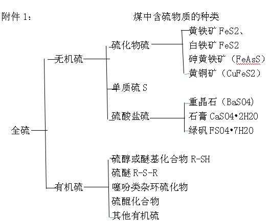 3、在选用原料中添加固硫剂脱硫方法前,必须先测定燃料煤中硫的种类与含量。煤系燃料中的硫主要是有机硫和无机硫两种形式存在。无机硫包括硫化物、硫酸盐和少量的单质硫三部分。硫化物包括有黄铁矿、白铁矿、闪锌矿、方铅矿、磁黄铁矿、黄铜矿、砷黄铁矿等,一般黄铁矿是煤中主要硫化物。硫酸盐包括有重晶石、石膏、无水石膏、绿矾等。有机硫则有硫醇、二硫化物、噻吩硫、硫醚及其他有机硫(见附件1:煤中含硫物质的种类)。
