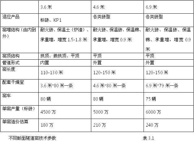 各种断面的隧道窑设计也相对成熟了,产量比前几年有所提高。表3.1总结了有代表性的不同断面隧道窑技术参数,供大家借鉴: