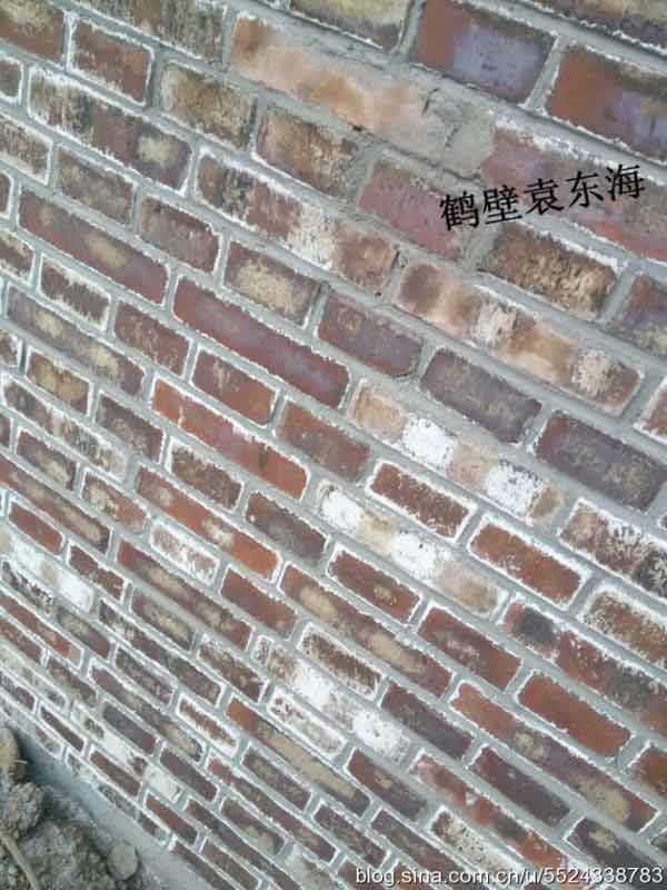 观察用户使用情况时发现,墙体的底部和上部变色较中间部位严重。这种现象是底层砖回潮和顶层砖雨淋有关;同一生产日期的砖在不同墙体中变色的程度不一;砖变色程度与砌筑砂浆的配比有很大关系,即:砂浆中水泥使用量越高,砖的颜色变化愈加严重,当使用黏土砂浆时,颜色变化轻微(如图)。对水泥的调查发现,为当地一家规模不大的建材企业生产。