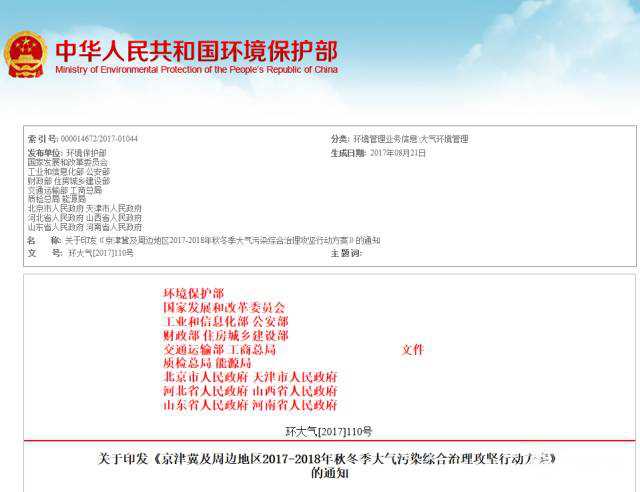 近日,环境保护部、国家发展和改革委员会、工业和信息化部、公安部、财政部、住房城乡建设部、交通运输部、工商总局、质检总局、能源局等10部门,北京、天津、河北、山西、山东、河南等6省市联合印发《京津冀及周边地区2017-2018年秋冬季大气污染综合治理攻坚行动方案》(以下简称“方案”), 旨在全力做好2017-2018年秋冬季大气污染防治工作,坚决打好“蓝天保卫战”。