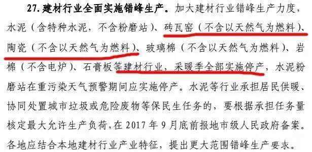 方案中要求,京津冀及周边地区即“2+26”城市的砖瓦(不含以天然气为燃料)、陶瓷(不含以天然气为燃料)等行业,采暖季(2017年11月15日—2018年3月15日)全部实施停产。