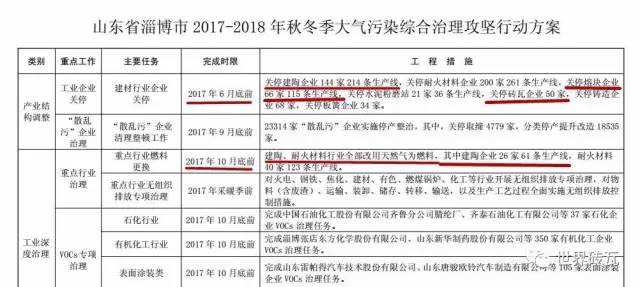 淄博市秋冬季大气污染综合治理攻坚行动方案中提出,在2017年6月底前关停砖瓦企业50家,关停建陶企业144家214条生产线,关停耐火材料企业200家261条生产线等。