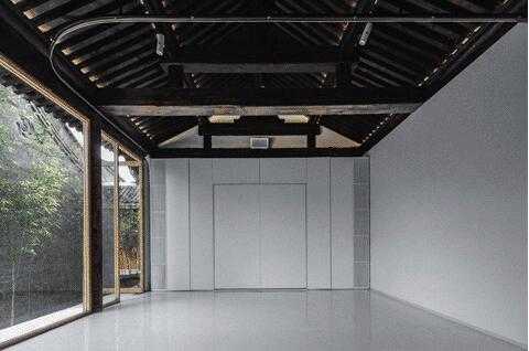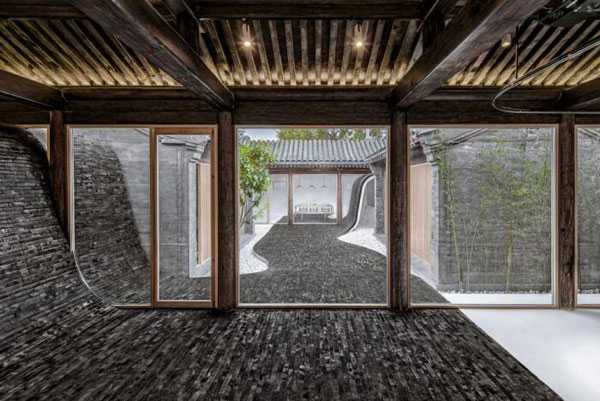 改变原本四合院的庄重、刻板的印象,营造开放、活跃的院落生活氛围。基于已有院落格局,利用起伏的地面连接室内外高差并延伸至房屋内部扭曲成为墙和顶,让内外空间产生新的动态关联。隐于曲墙之内的是厨房、卫生间、库房等必要的服务性空间;显于曲墙之外的会客、餐饮空间与庭院连接成为一个整体。室内外地面均采用灰砖铺就,院中原有的一颗山楂树也被保留在扭动的景观之中。