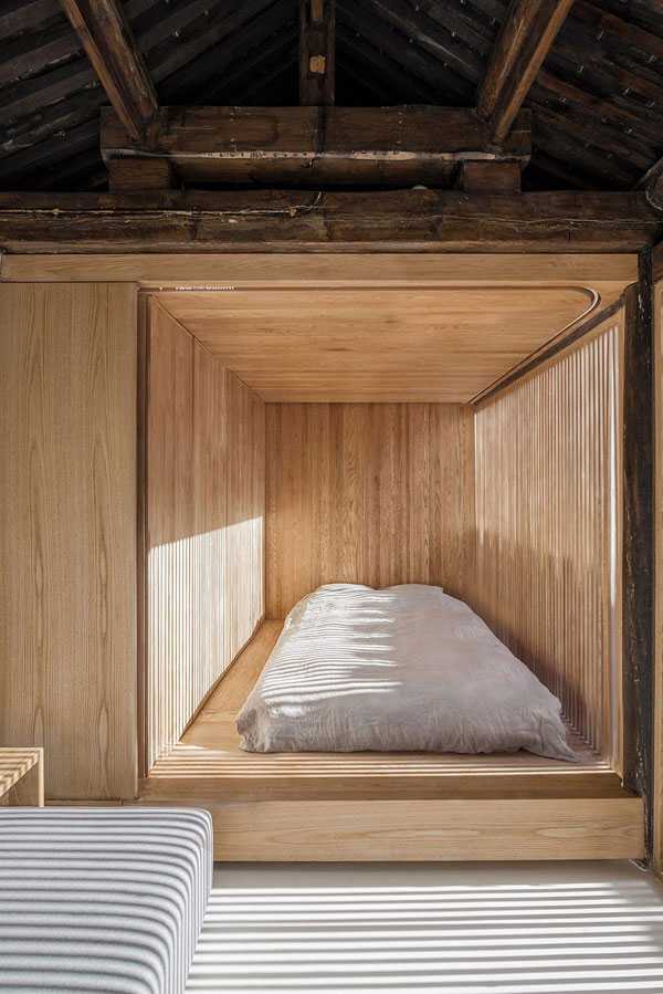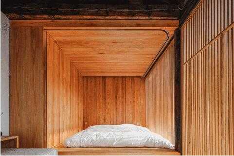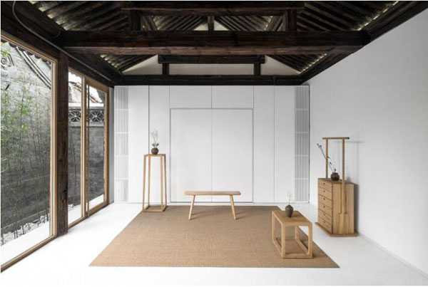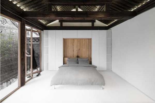 小院儿的使用主要作为城市公共活动空间,同时也保留了居住的可能性。四间房屋可被随时租用来进行休闲、会谈、聚会等公共活动;同时也可以做为带有三间卧室的家庭旅舍。整合式家具用来满足空间场景的这种弹性切换。东西厢房在原有木框架下嵌入了家具盒子。木质地台暗藏升降桌面,既可作为茶室空间,也可以作为卧室来使用。北侧正房也设有翻床家具墙体和分隔软帘,同样可以满足这种多用需求。