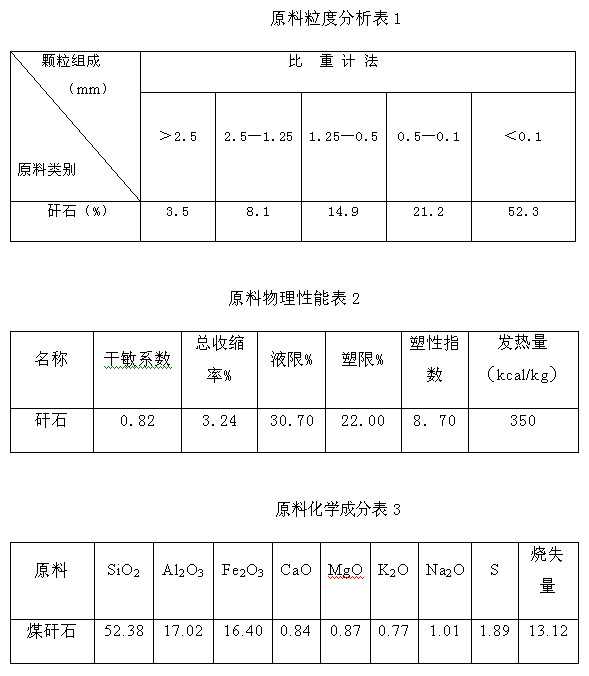破碎车间设计产能不低于1300t/天,每天工作10h,夜间生产白天维修。环美分院在破碎车间设计上大胆突破,改变其他设计院经常采用的破碎楼结构,采用平面设计,原料运输采用普通皮带机,淘汰斗式提升机及刮板输送机等高成本设备。因原料上井时间短,难于破碎,该生产线采用两级破碎工艺。一级破碎采用高效环锤,选用两台,每台功率45kW,产量在100t左右;二级破碎采用高细锤破,共三台,单台功率132 kW,平时两开一备,回料采用两台笼式粉碎机进行二次破碎。笼式粉碎机维修量大,很多厂家不愿使用,但笼粉破碎细料量大,颗粒级配合理,是其他设备无法替代的,特别是含氧化钙高的原料、塑性差的原料,建议选择笼式粉碎机。实践证明该破碎工艺完全满足生产需要,每天夜间生产10h即可满足全天生产需要。筛分设备选用四台高频振动筛,除尘设备选用两台96-5的袋式除尘器。原材料性能见表1、表2、表3。