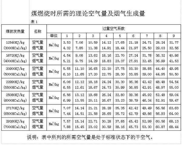 此外,还可以通过查表1,按煤的发热量查出其燃烧所需的空气量及烟气生成量。