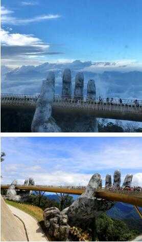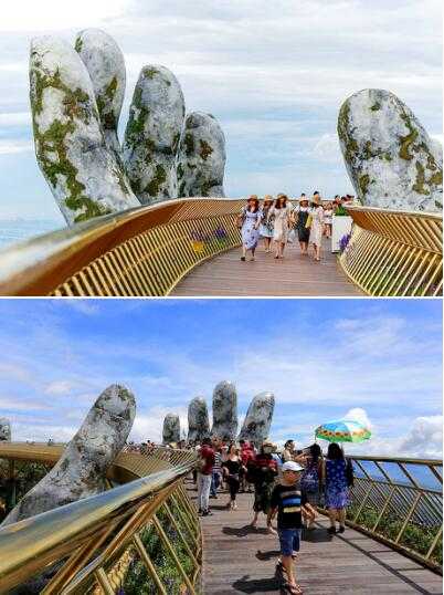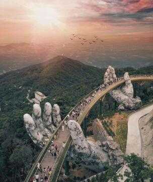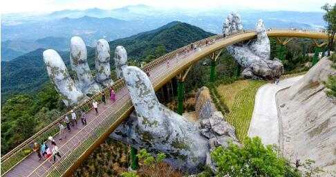 在越南岘港(Da Nang)上面群山中,有一座设计独特的桥梁。这座穿行在鲜花丛中,长150米的桥梁蜿蜒曲折,是在巴纳山映衬下的一座闪闪发光的金桥,而这座桥是由一双大手支撑起来的。