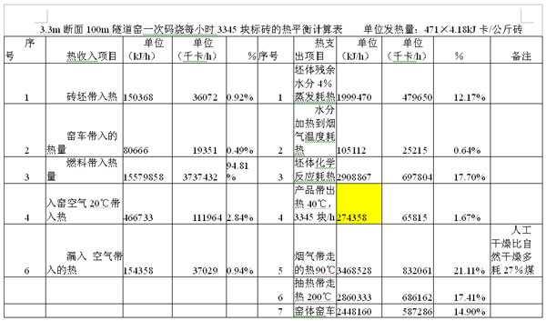 节能依据:热量平衡表是热能收入支出账本,可以发现浪费的热量,而减少浪费是节能的关键。以一个3.3m断面,100m长的隧道窑热平衡计算表为例: