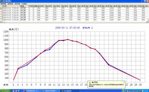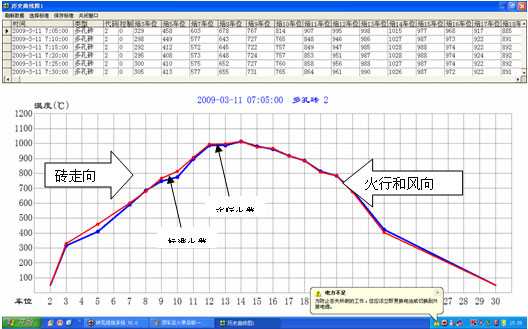 如果按标准火带曲线烧砖,当实际火带曲线(红线)与标准火带曲线(兰线)重合即顶车,就可实现定温定点的焙烧。