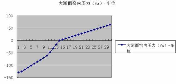 16到23车位高温气体膨胀近3~4倍,流速加快3~4倍,该段两车位压差为17~25Pa,25~33车位压差为5~10Pa;15车位有漏风,温度下降了100℃,压力升高到30Pa;1~5车位哈风闸没有用起来,故最负的压力点在6车位。