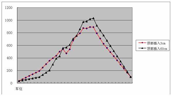 小断面隧道窑在高负压-320Pa下,抽风时顶部插入3cm的顶部风温,与顶部插入60cm的顶部风温的差距见下图: