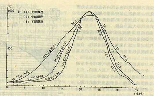 下图为大断面隧道窑上部、中部、下部的烧成时间——温度曲线: