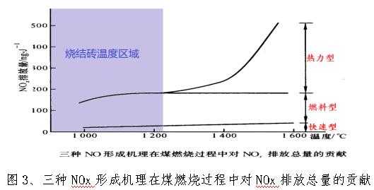 由于烧结砖温度一般不会大于1250℃,多数在850~1050℃范围,在该温度下仅有燃料型NOx和少量快速型NOx产生,砖瓦行业降低NOx排放的重点在减少燃料型NOx。下图更直观: