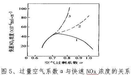 根据NOx的生成动态和与过量空气系数的关系,可以把过量空气系数α的影响分成三个区域: